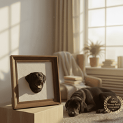 A_framed_3D_memorial_sculpture_of_a_black_Labrador_s_head_displayed_in_a_cozy_room_with_a_sleeping_dog.