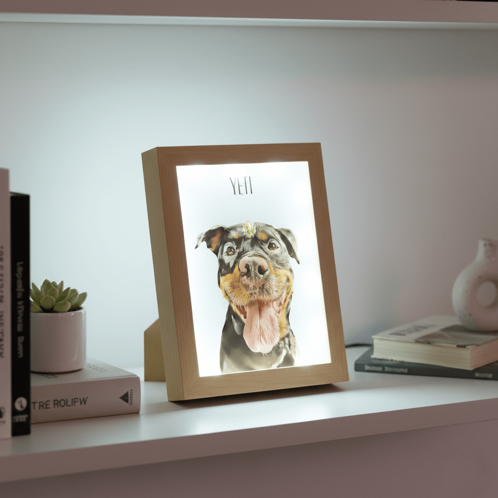Illuminate your space with a loving tribute to your best friend. Our LED-powered portraits are more than just pictures; they are unique works of art, custom-designed by a real artist who pours their time and care into capturing the very soul of your pet.