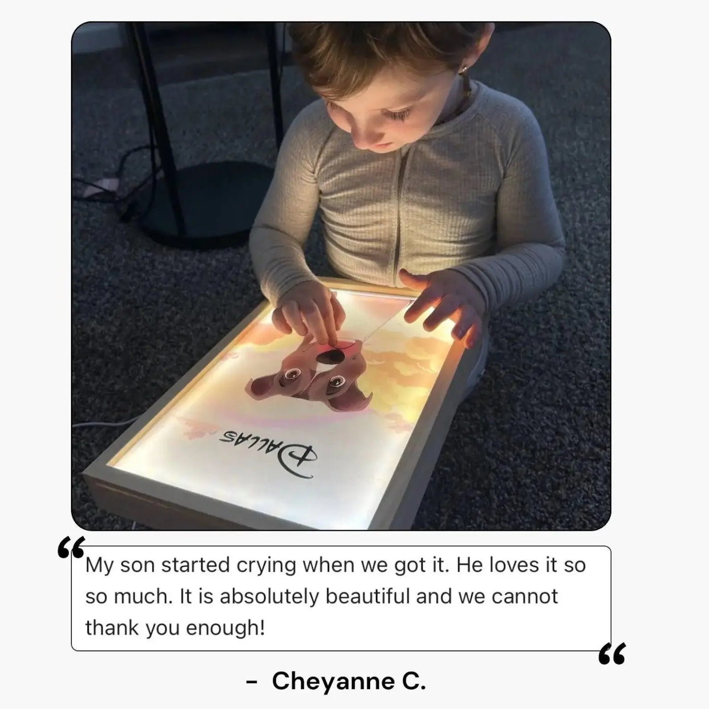 With the simple click of a button, watch the artwork glow, filling your room with a soft, comforting light that radiates the warmth and spirit of your companion. It's a beautiful reminder that while they may be gone, their light never truly fades.